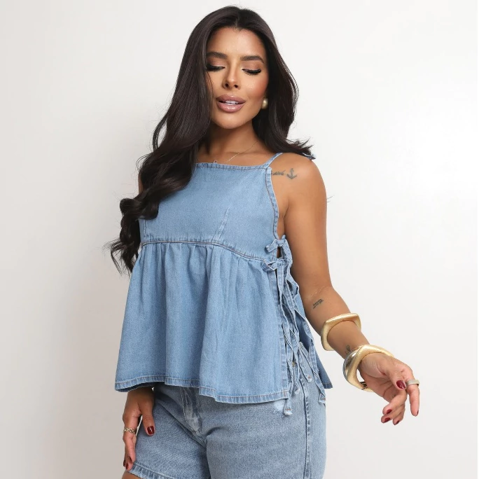 O grande diferencial deste modelo é a sua modelagem Peplum (estilo batinha), que é mais ajustada no busto e soltinha na cintura, valorizando a silhueta sem apertar. Além disso, possui detalhes apaixonantes de amarração nas laterais, trazendo um charme extra e exclusividade à peça. As alças também são de amarrar nos ombros, permitindo que você regule a altura conforme sua preferência.