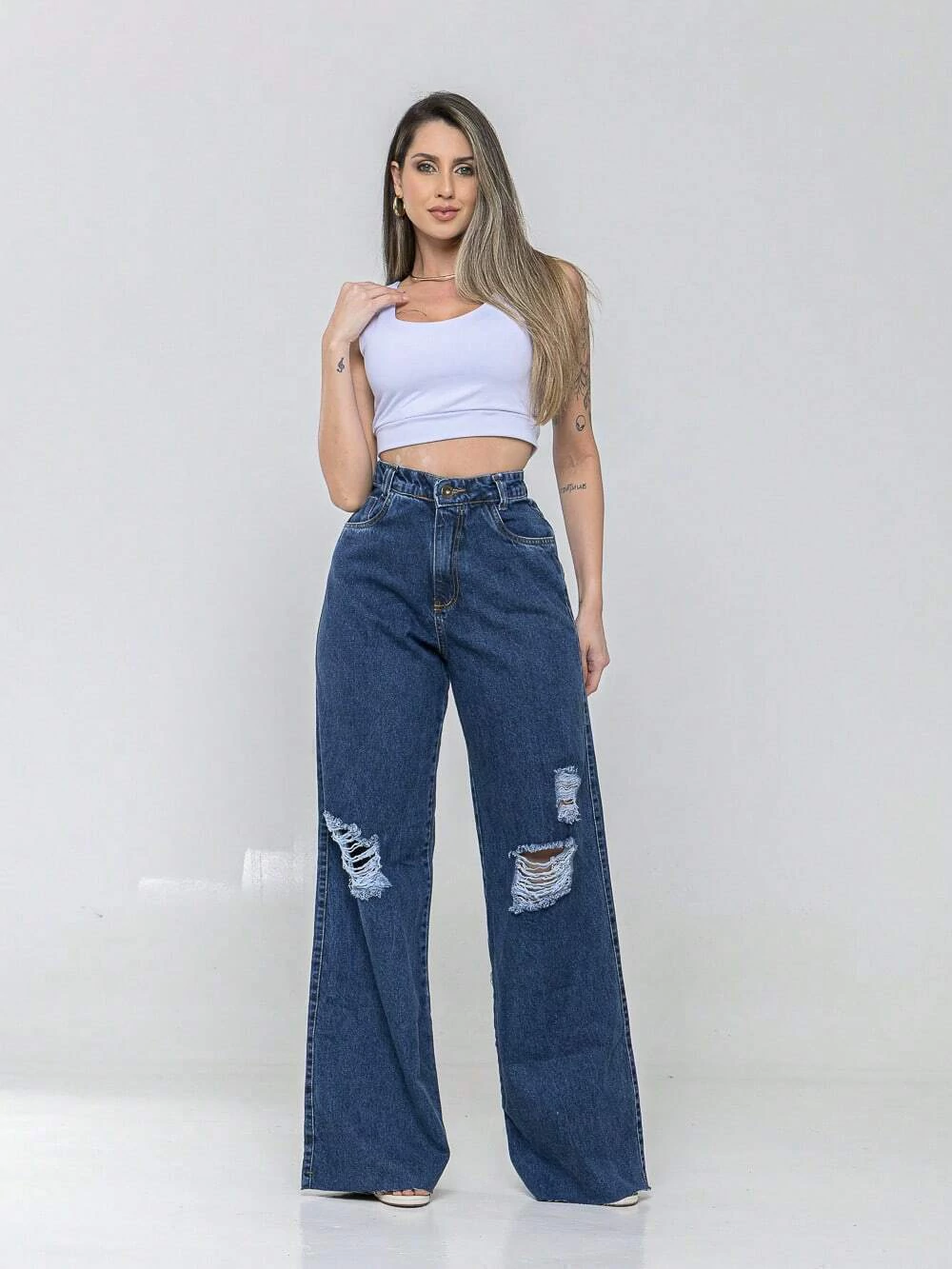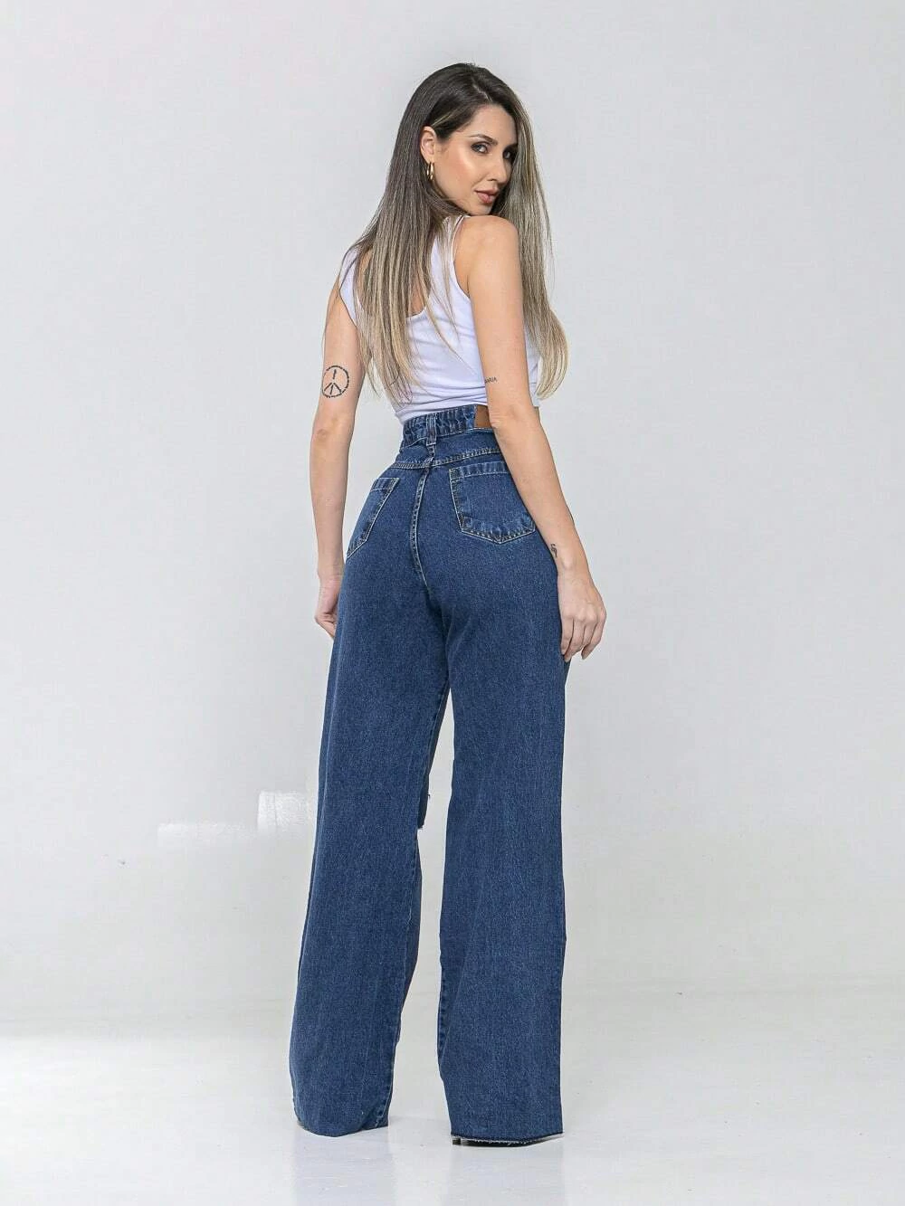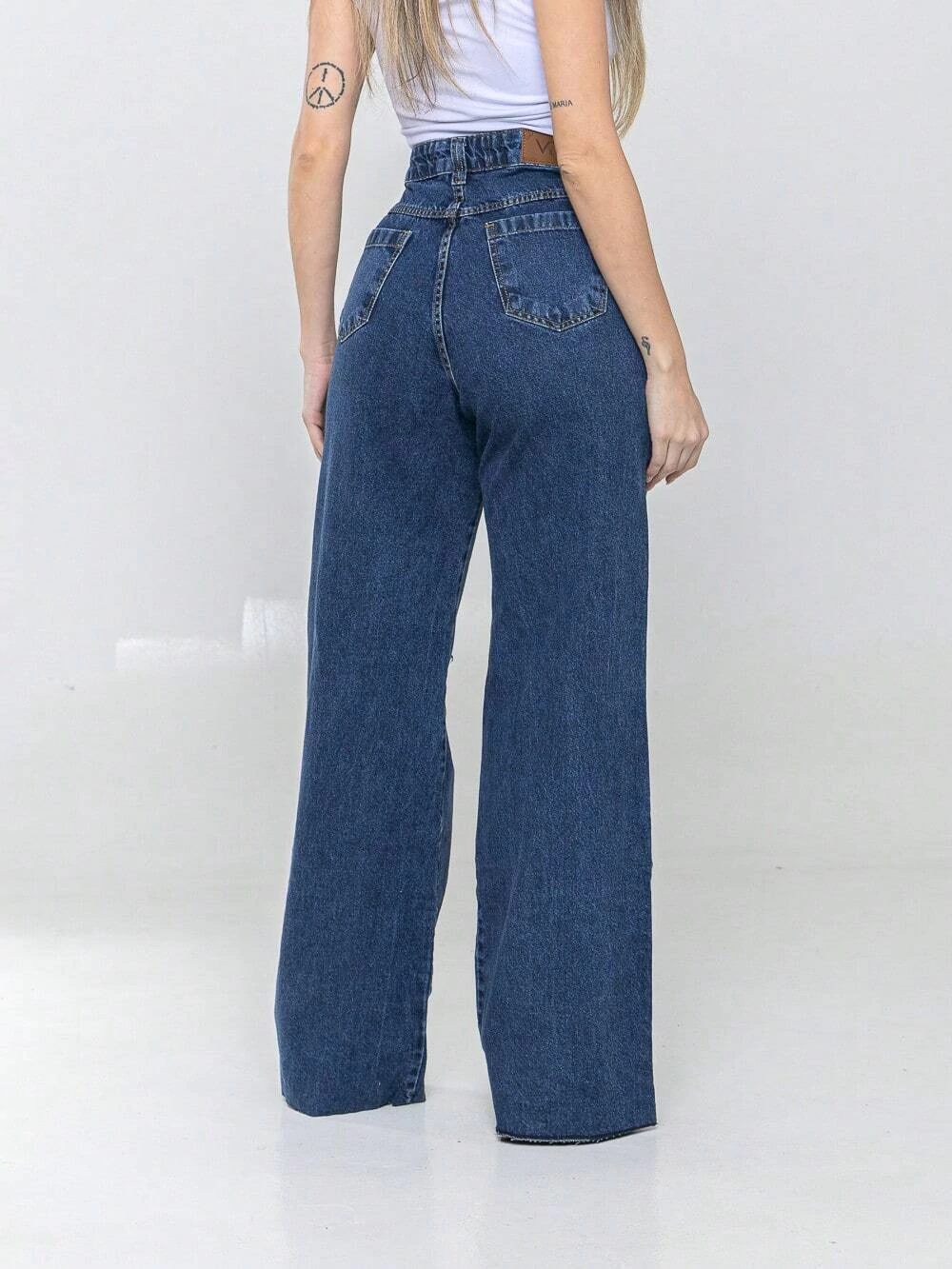 Calça Jeans Feminina Escura Wide leg Pantalona Desfiada com Bolso Qualidade Premium