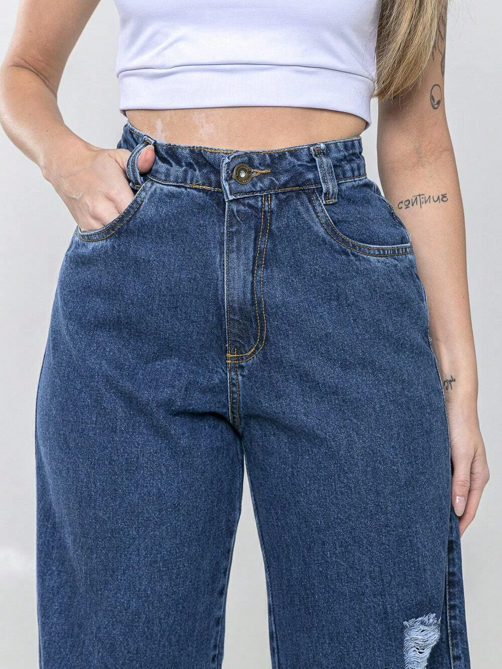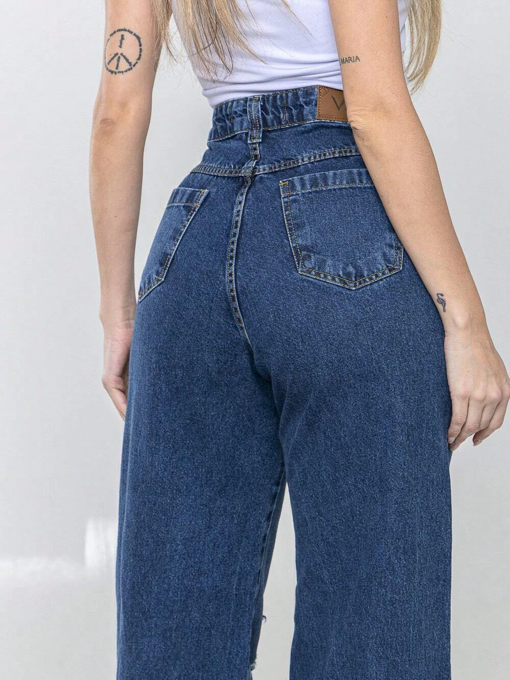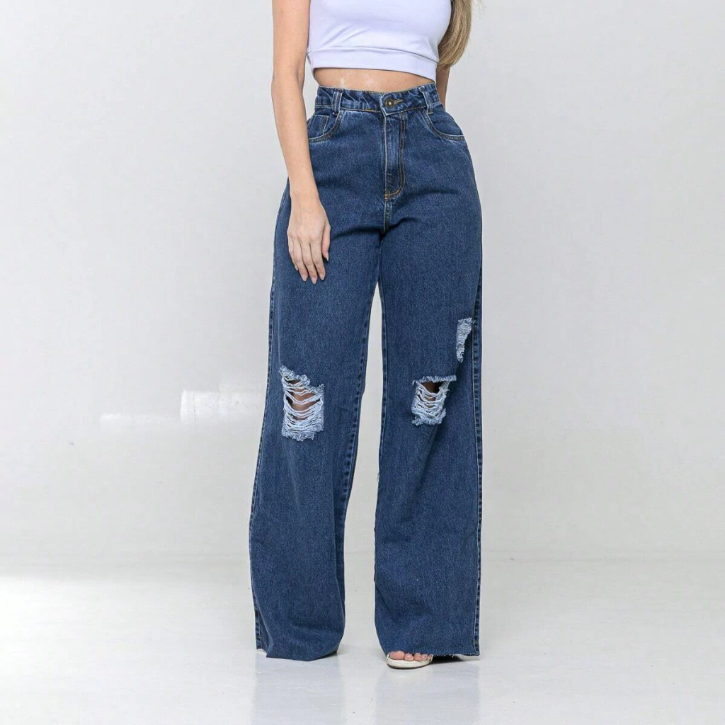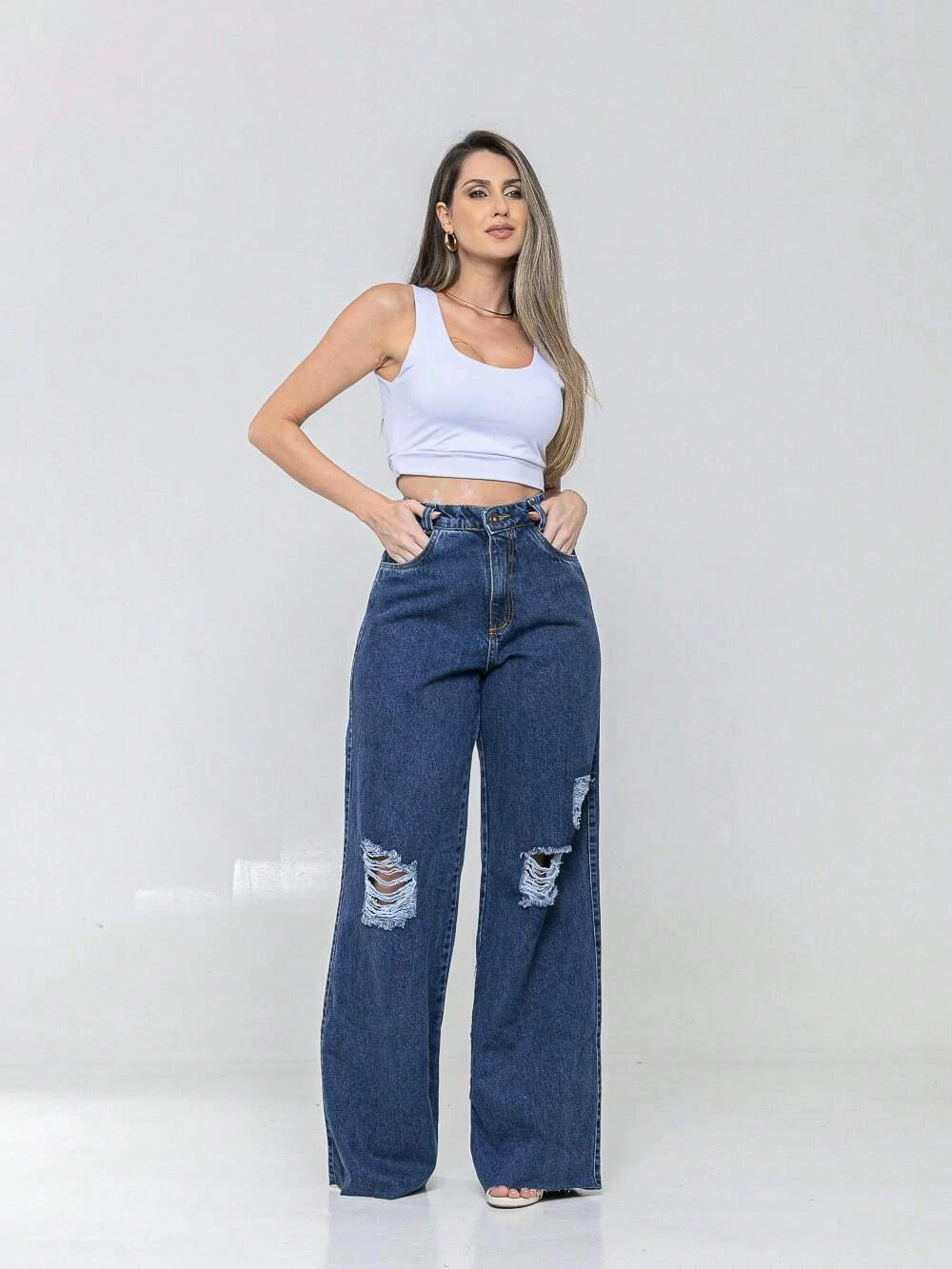 Calça Jeans Feminina Escura Wide leg Pantalona Desfiada com Bolso Qualidade Premium