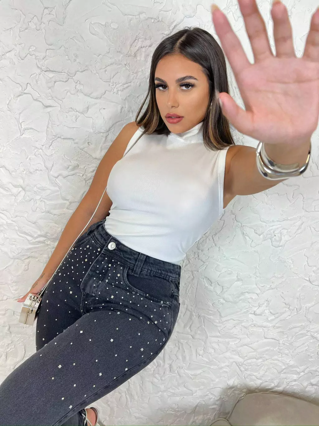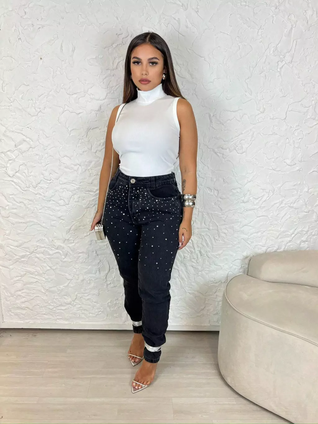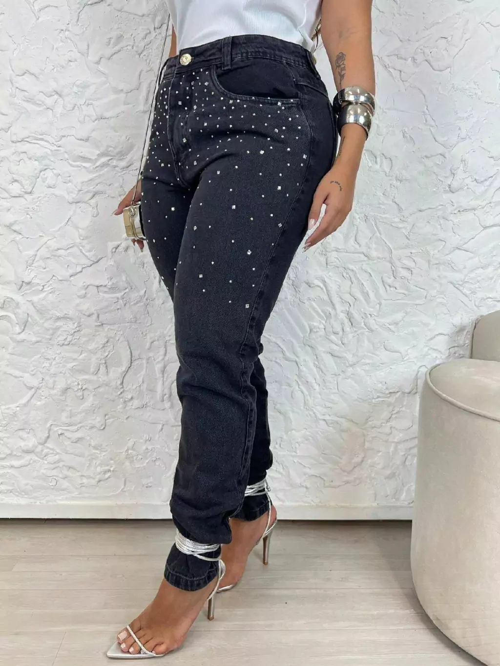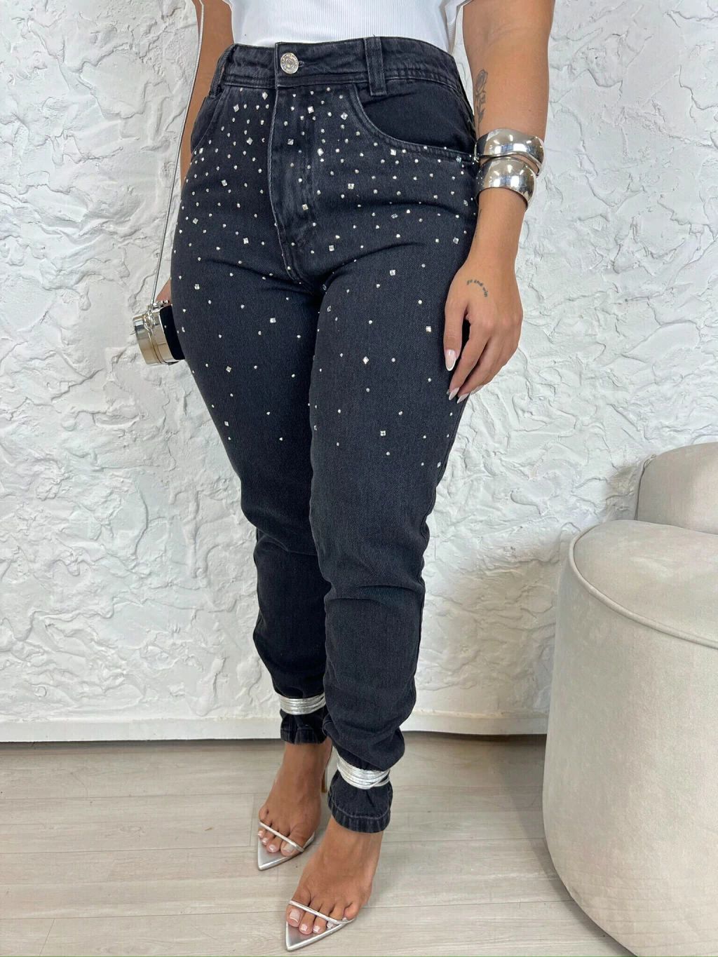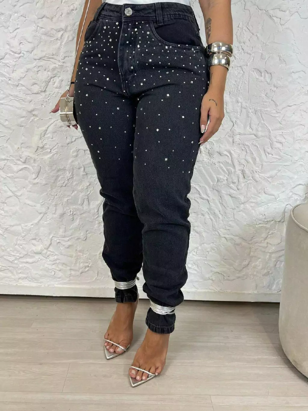 Calça Jeans Feminina Mom Preta Pedraria Brilho Strass com Bolso