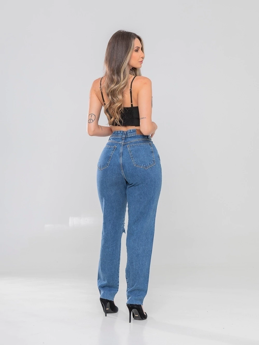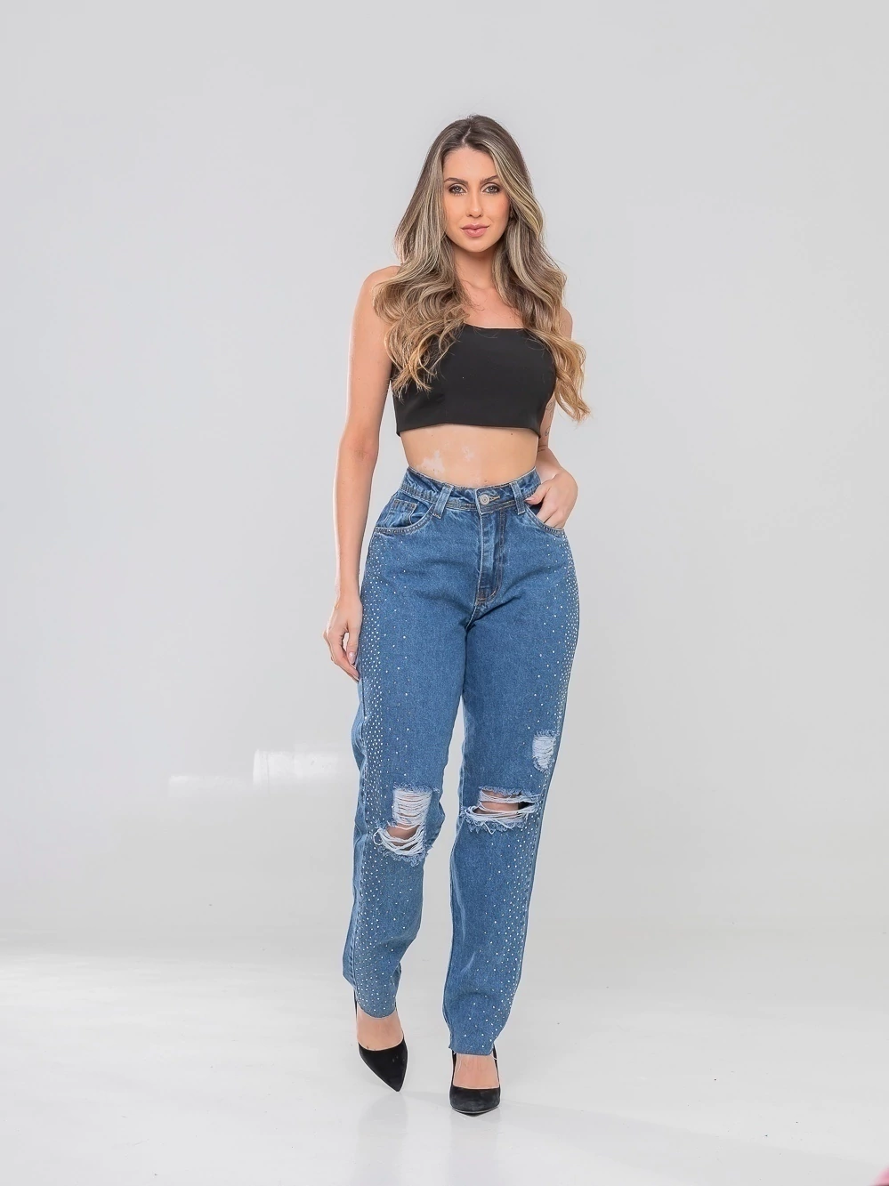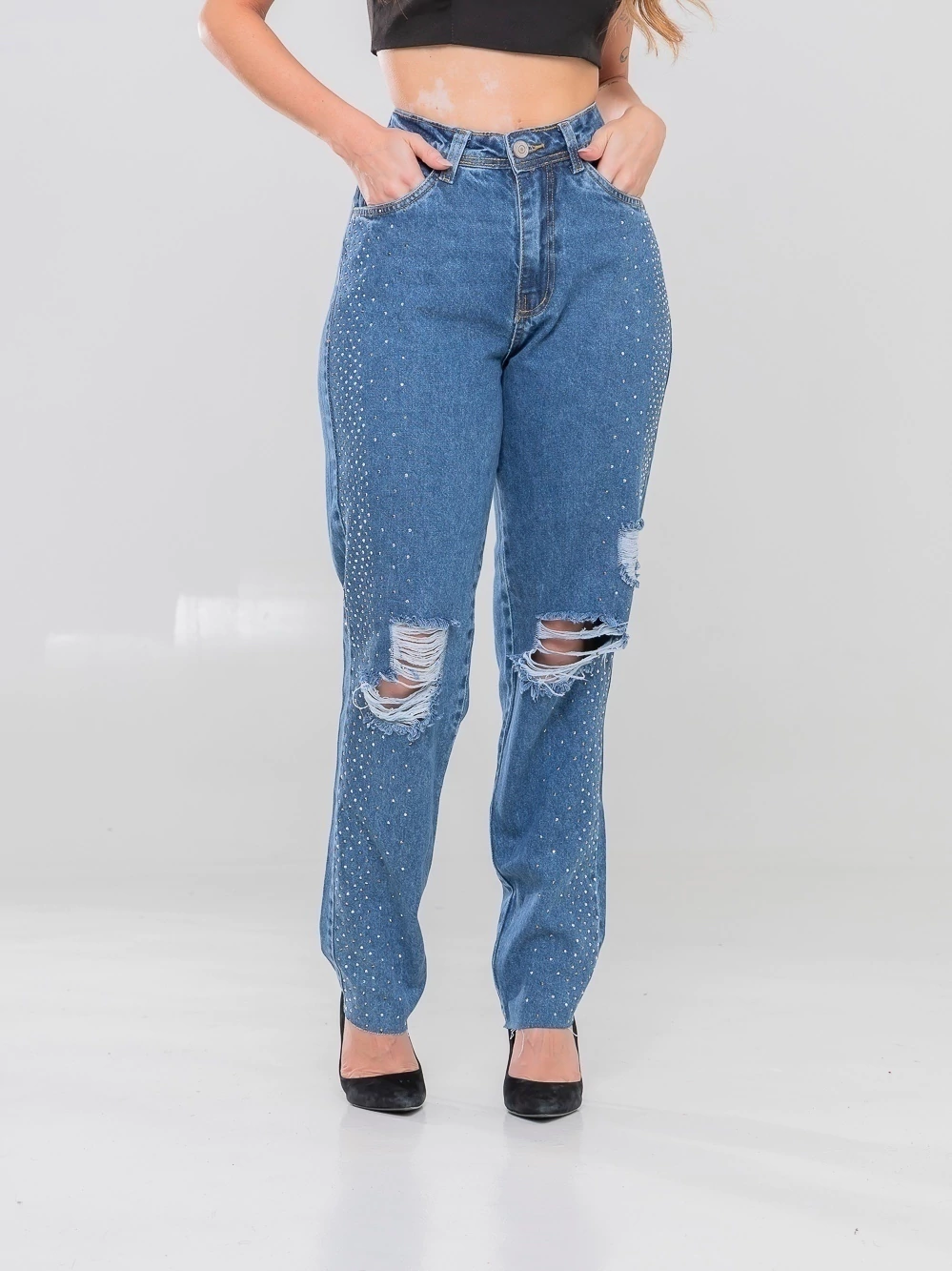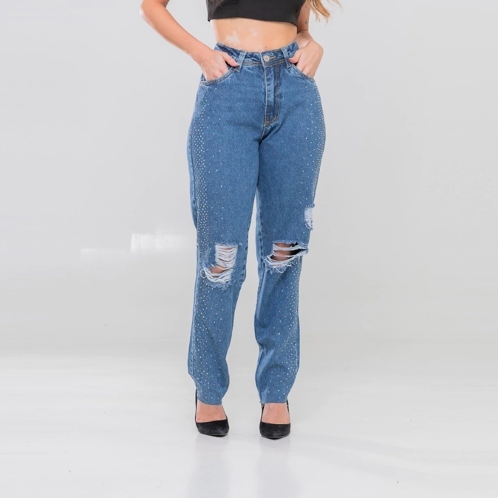 Calça Jeans Feminina Mom Puído Pedrinhas Pedraria Strass Aplique com Bolso Qualidade Premium