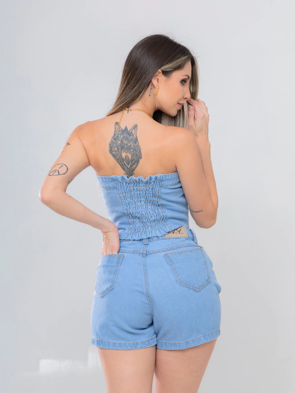 Conjunto Feminino Cropped Top Tomara que Caia Elástico + Short Jeans Com Bolso