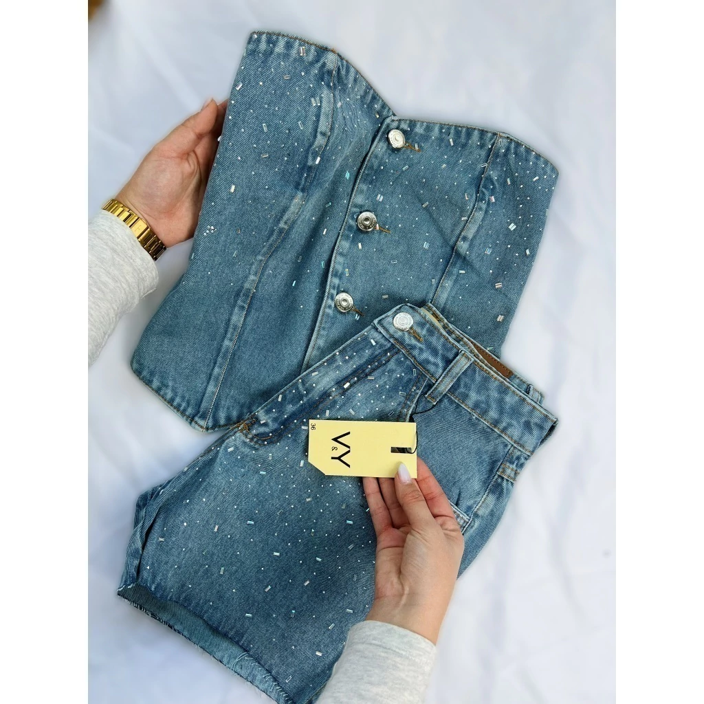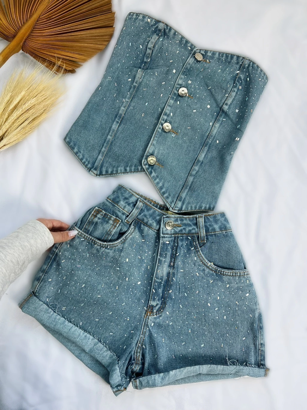 Conjunto Feminino Jeans Cropped + Short Pedraria Aplique Granulado Feminino Com Bolso