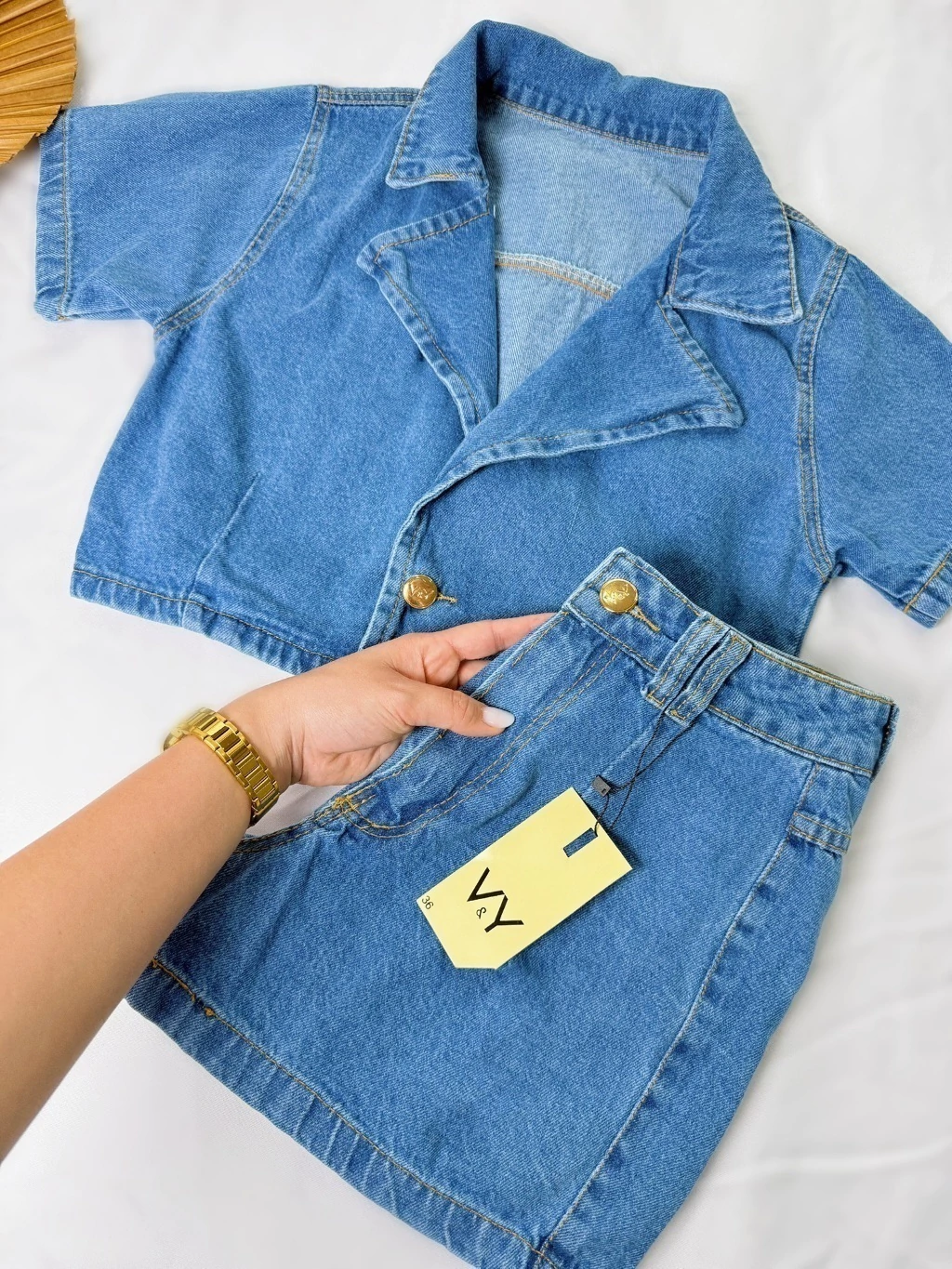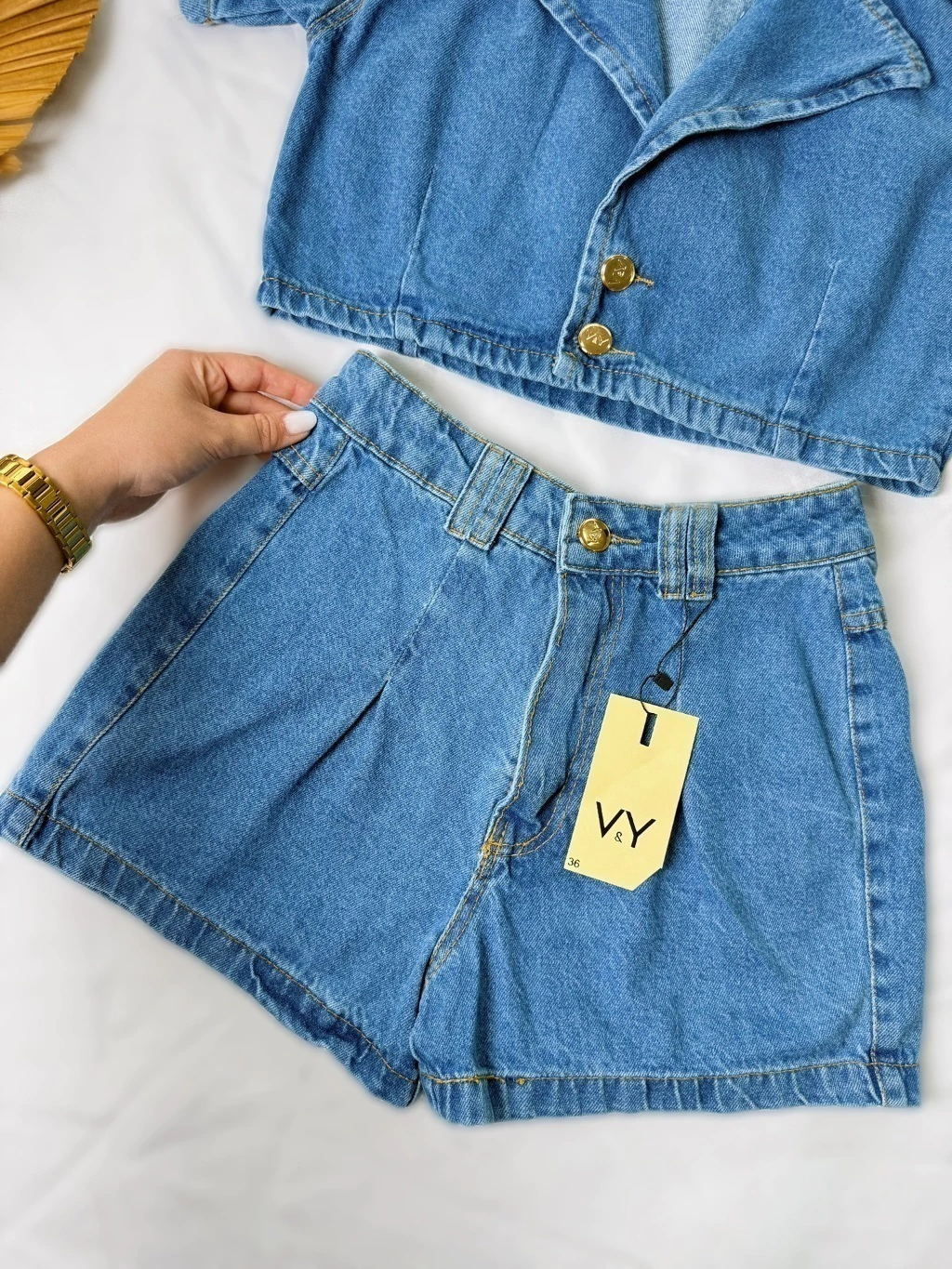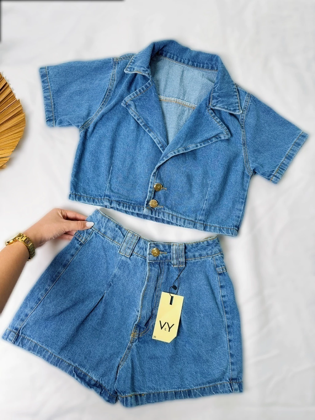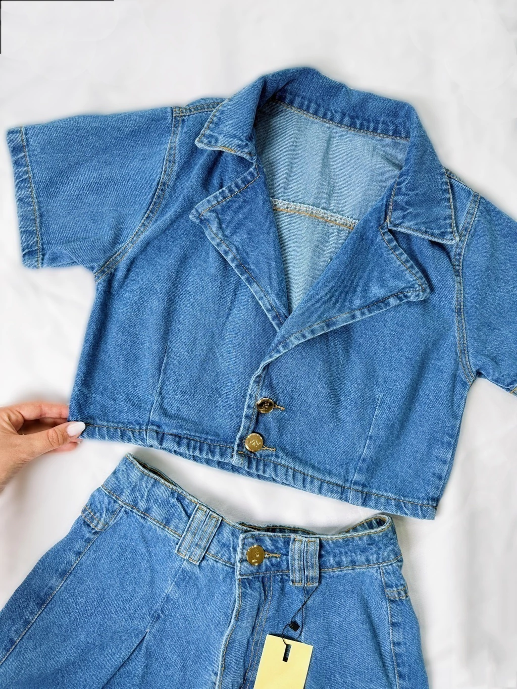 O look completo que faltava no seu guarda-roupa! Este conjunto em jeans de lavagem média combina a elegância do estilo blazer com o conforto e a modernidade do cropped e short cintura alta. Perfeito para quem busca uma peça statement para arrasar em qualquer ocasião.