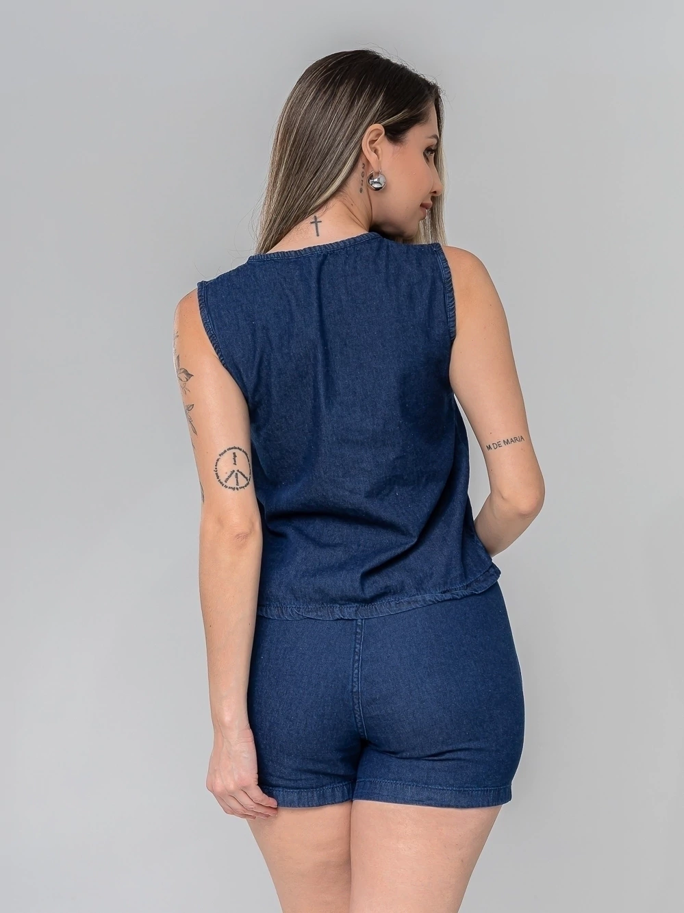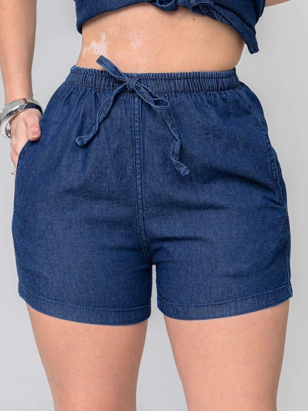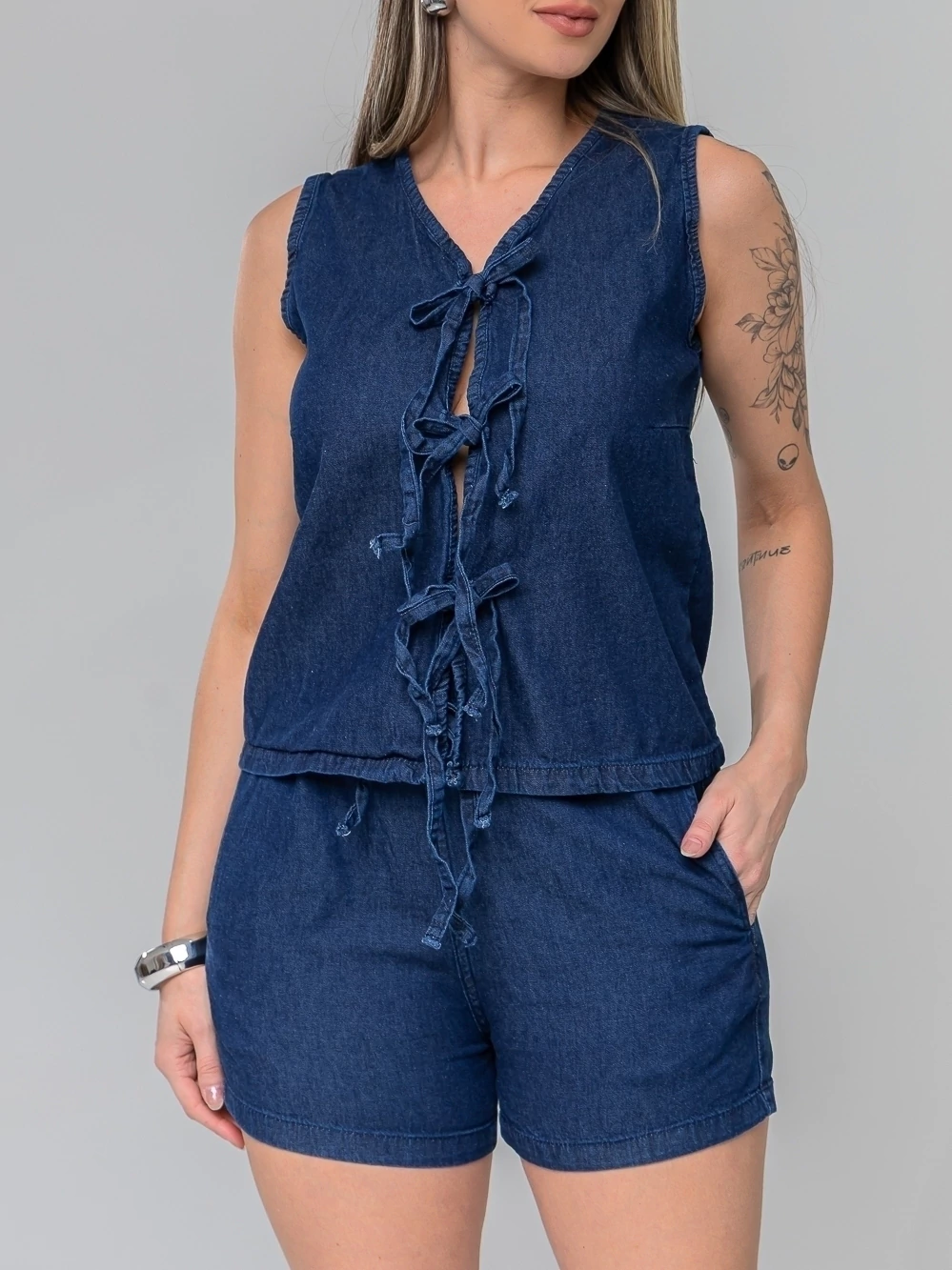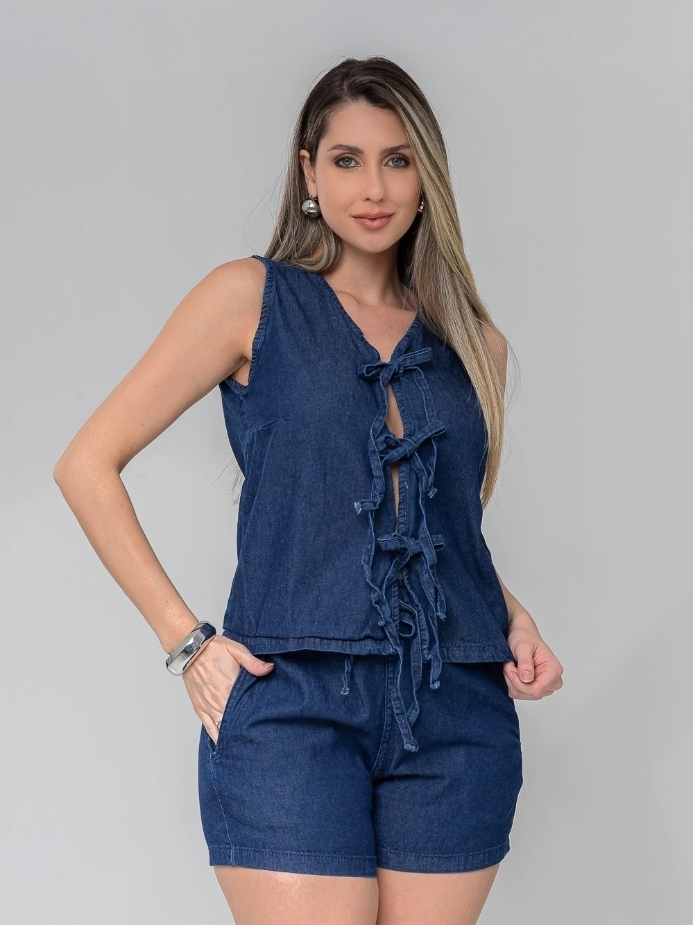 Perfeito para quem busca estilo, conforto e versatilidade em uma única peça! Este conjunto é a escolha ideal para passeios, encontros casuais ou até mesmo um look de verão mais arrumado. A modelo esta vestindo um 38 Características do Conjunto: Estilo da Blusa: Regata/Frente Única com decote V e detalhe frontal de amarrações ajustáveis, permitindo variar o decote e o caimento. Estilo do Short: Modelo soltinho, super confortável, com bolsos laterais e cintura elástica/cordão (ajustável). Tecido: Jeans 100% Algodão, leve, macio e ideal para o clima brasileiro. Cores: Azul Jeans Escuro Ocasiões: Casual, Passeios, Praia, Verão, Look Urbano. Tamanhos Disponíveis: O conjunto pode ser usado junto para um look "all jeans" fashion ou as peças separadamente: a blusa com calças de alfaiataria e o short com outras blusinhas ou biquínis. Adicione acessórios como brincos grandes e pulseiras (como a modelo) para um toque extra de estilo! Garanta já o seu Conjunto Jeans e arrase no look!