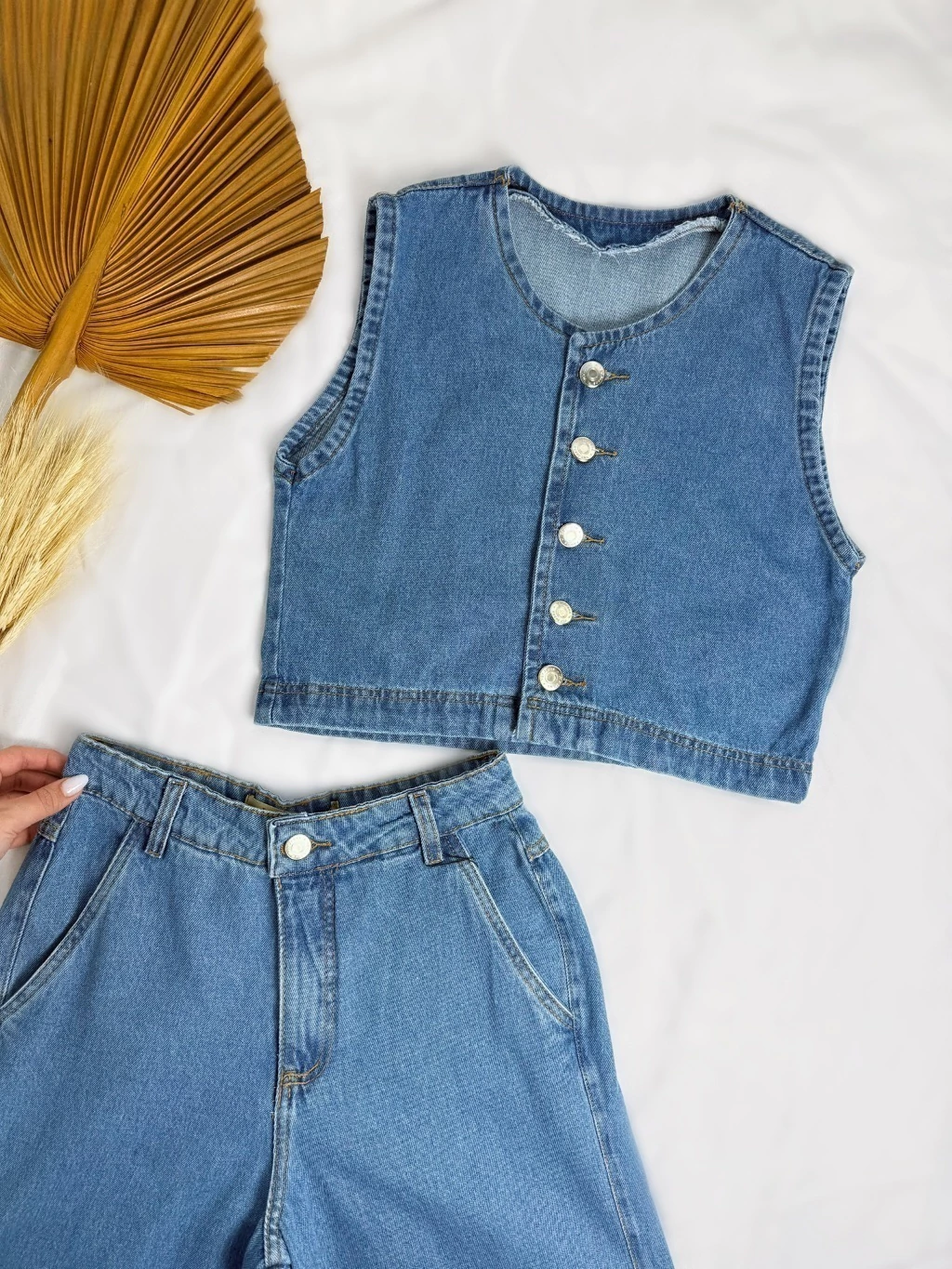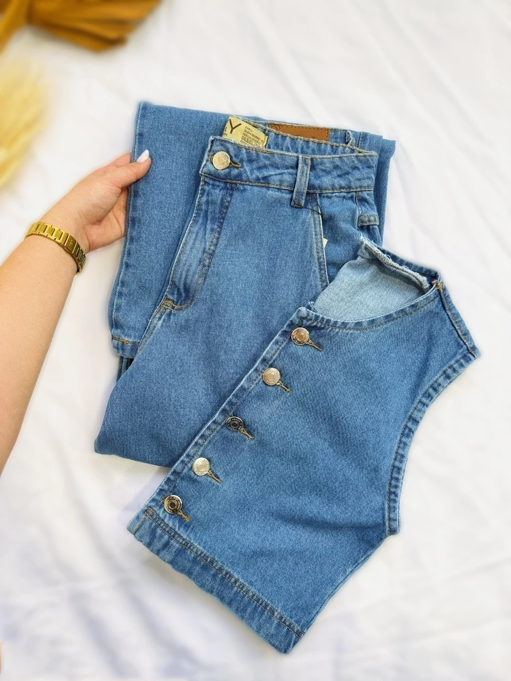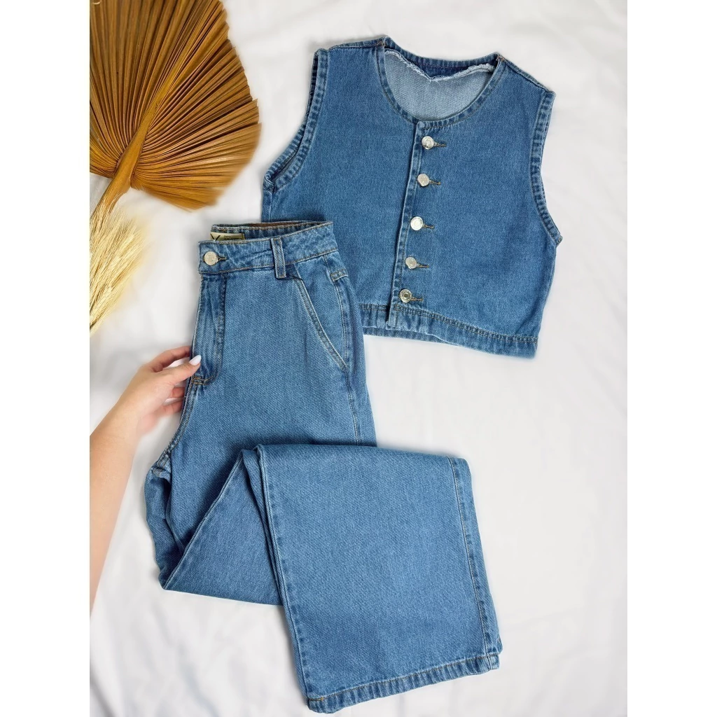 Conjunto Jeans Yas o Blusa Cropped Colete + Calça Com Bolso
