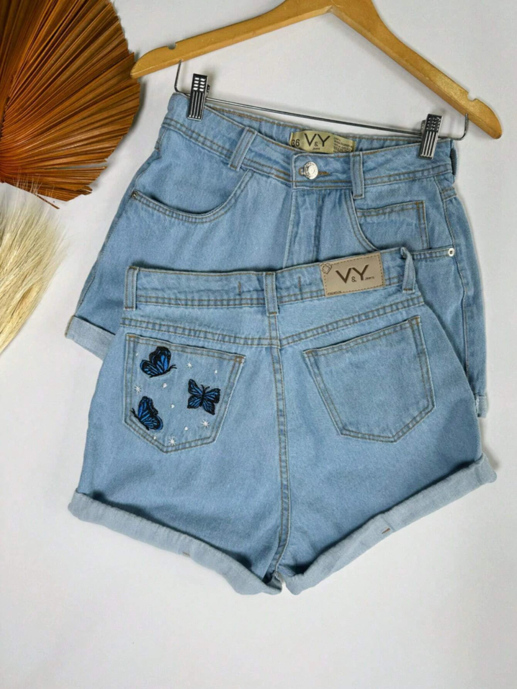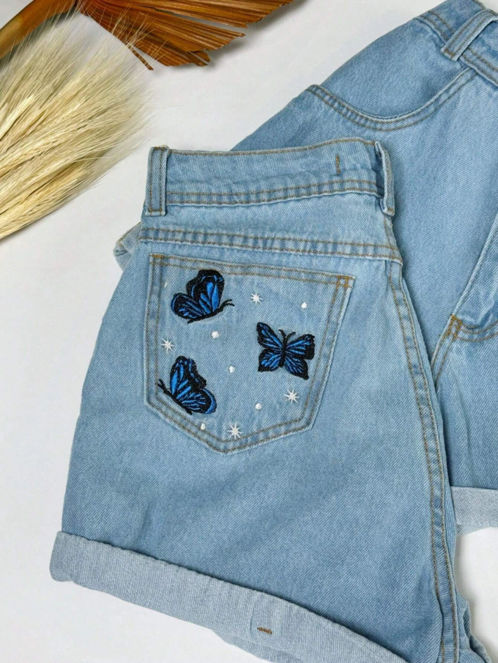 Short Jeans Feminino Borboleta Azul Bolso Traseiro Com Bolso