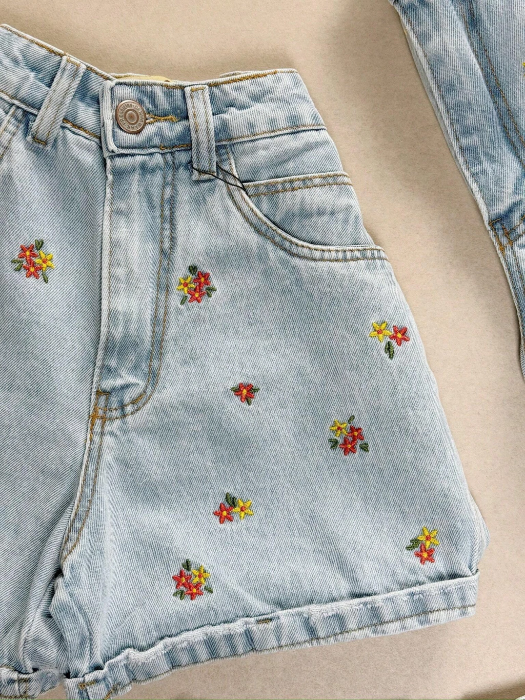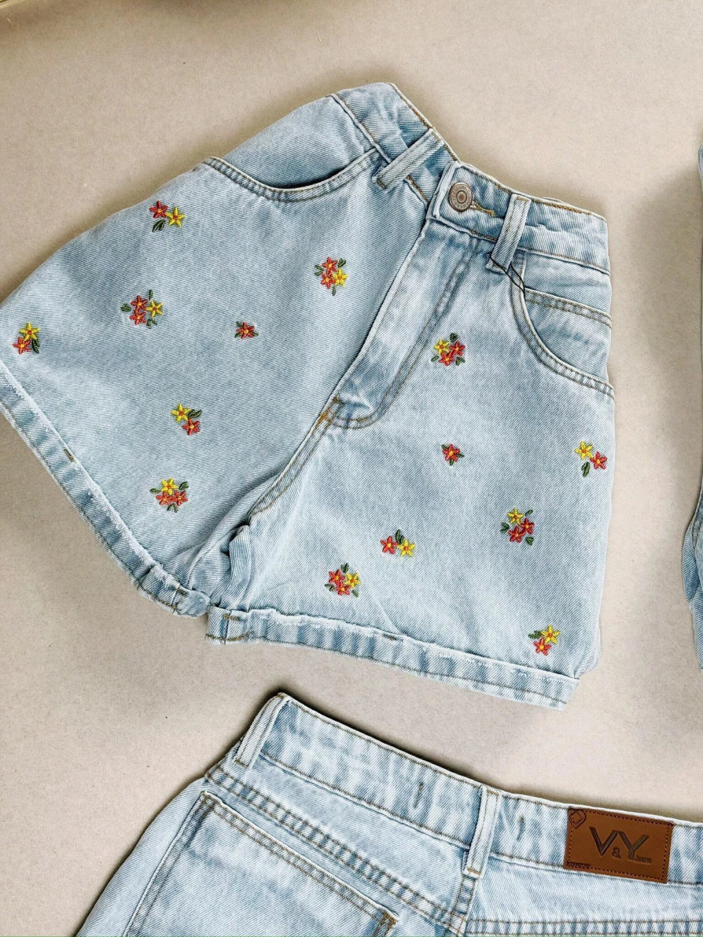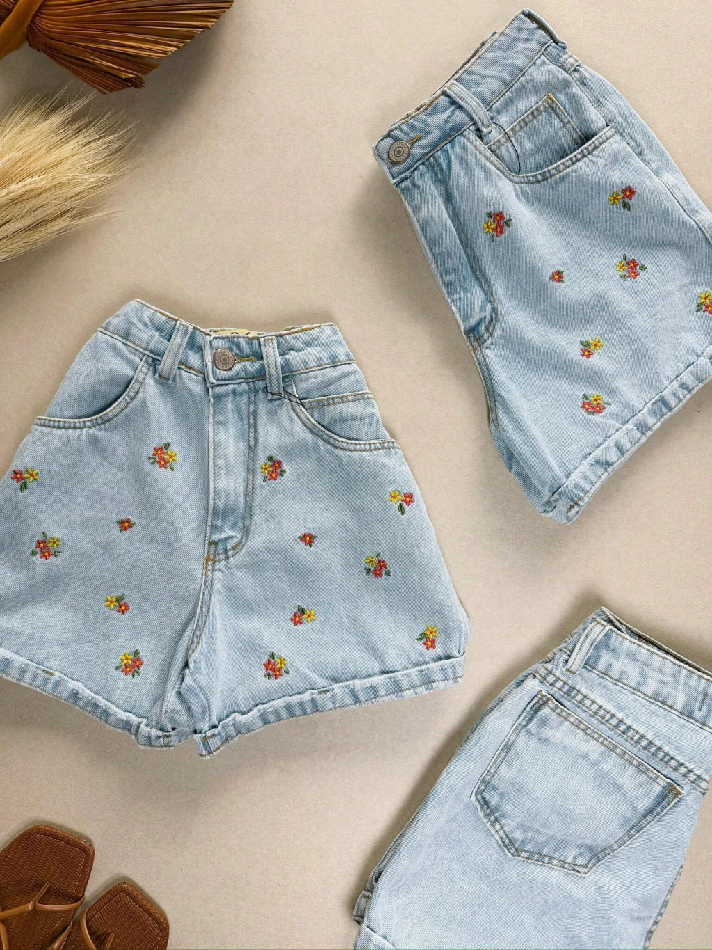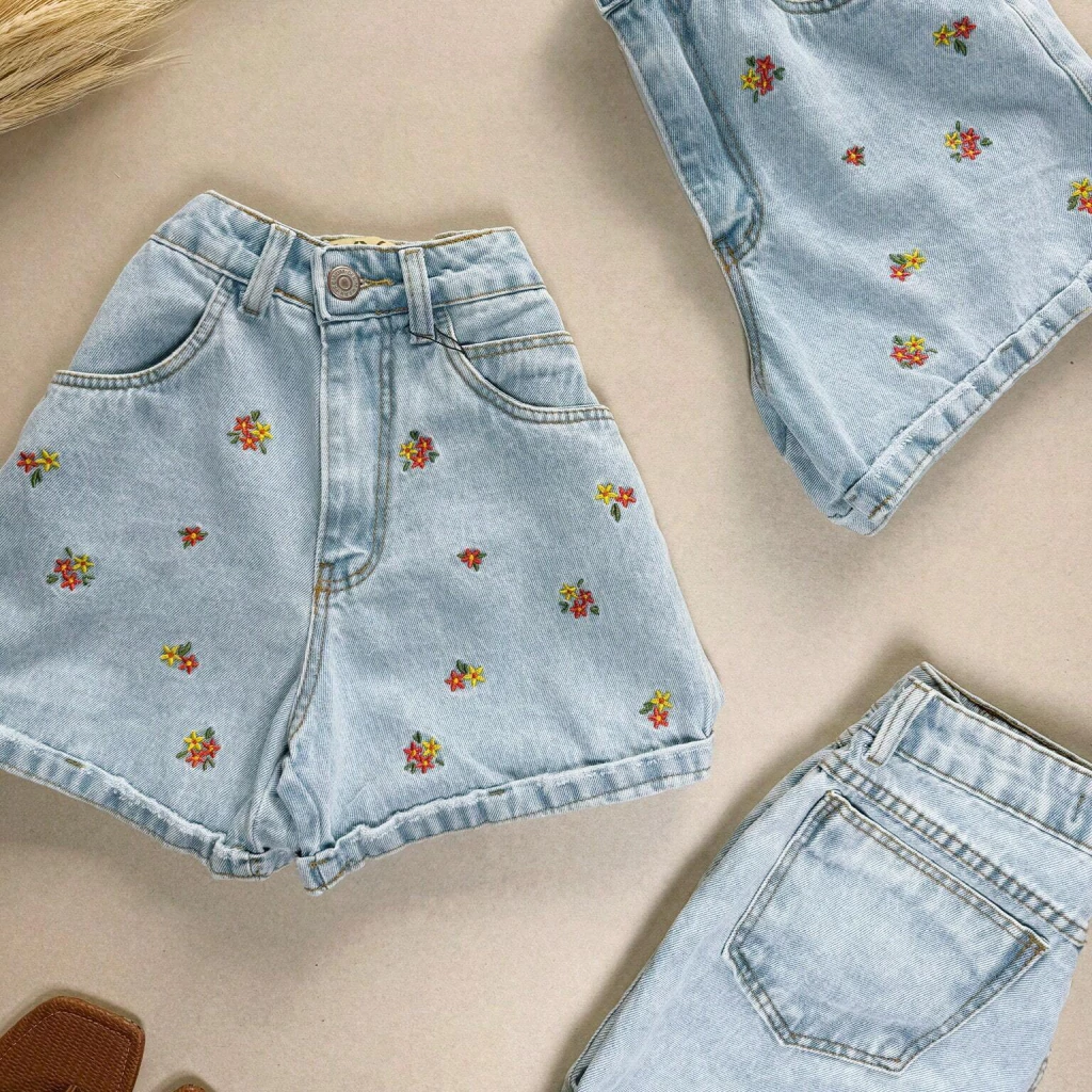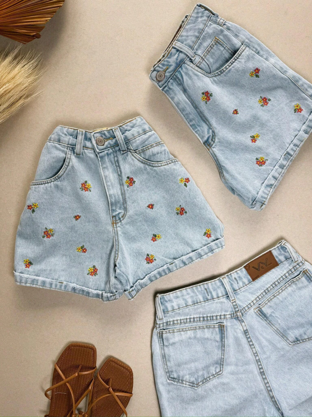 Short Jeans Feminino Bordado Buque de Flores Com Bolso