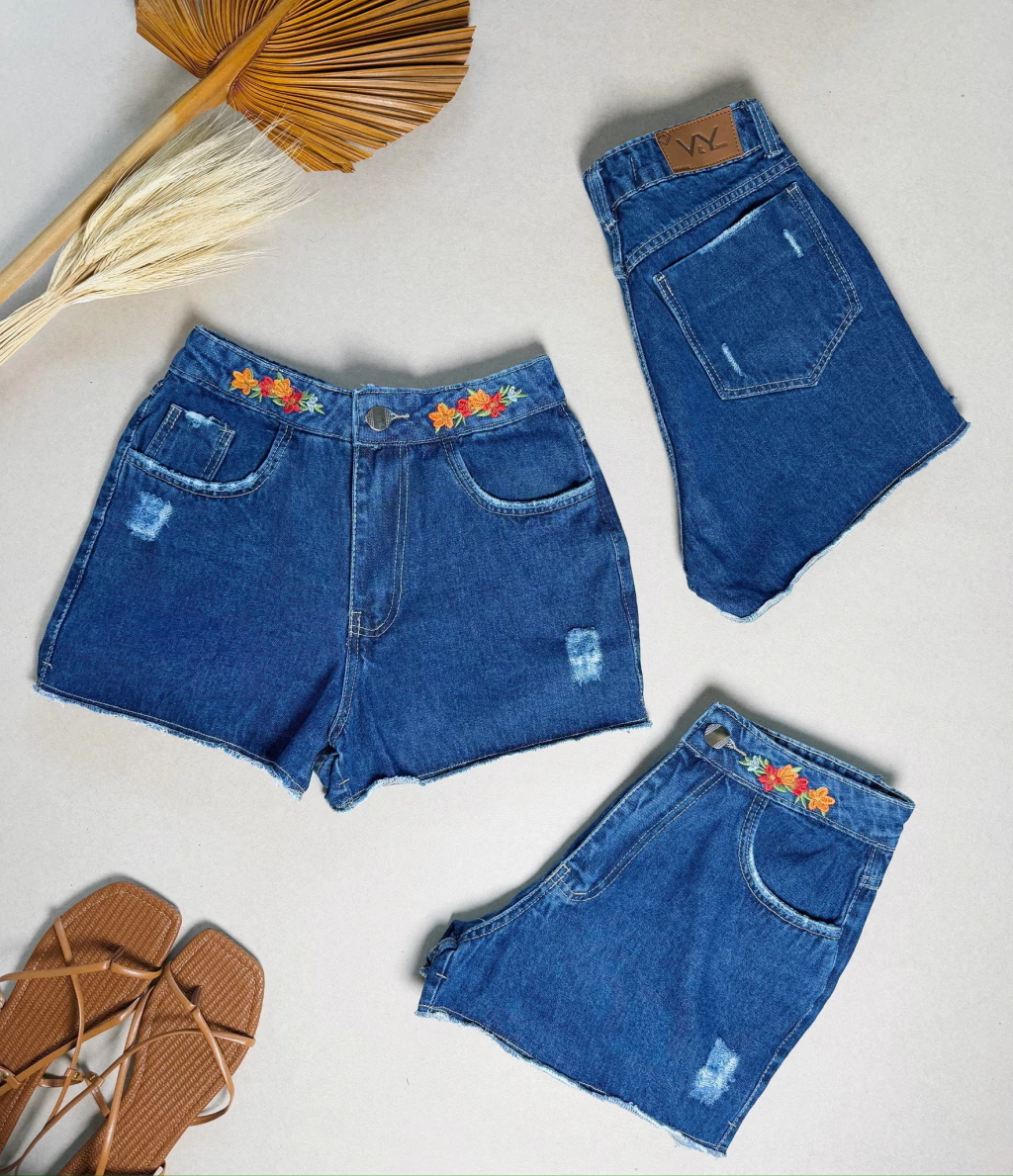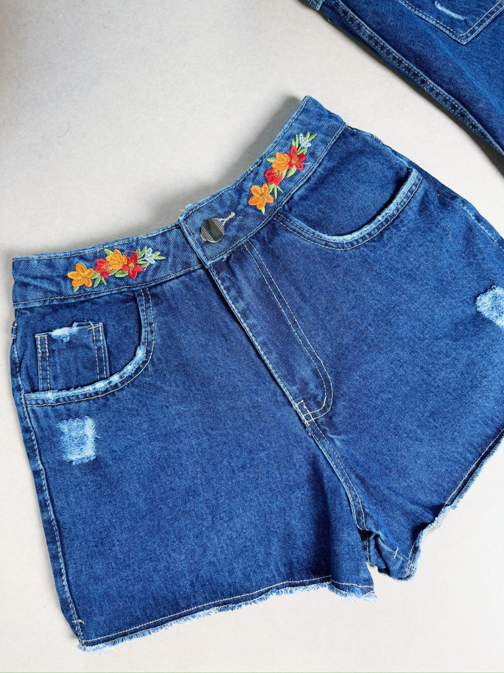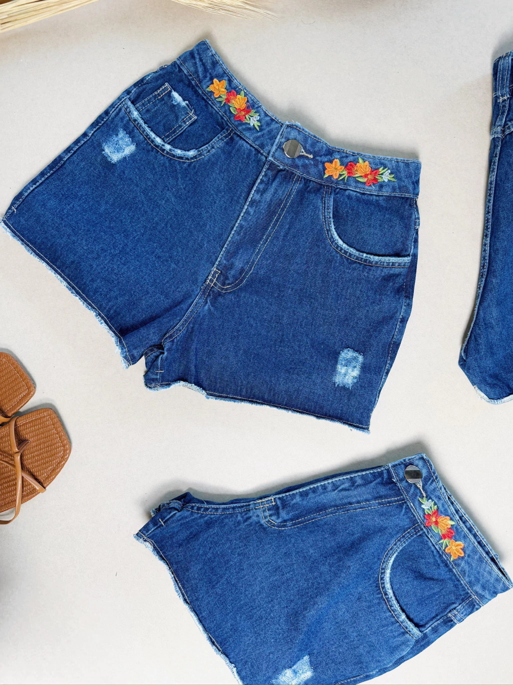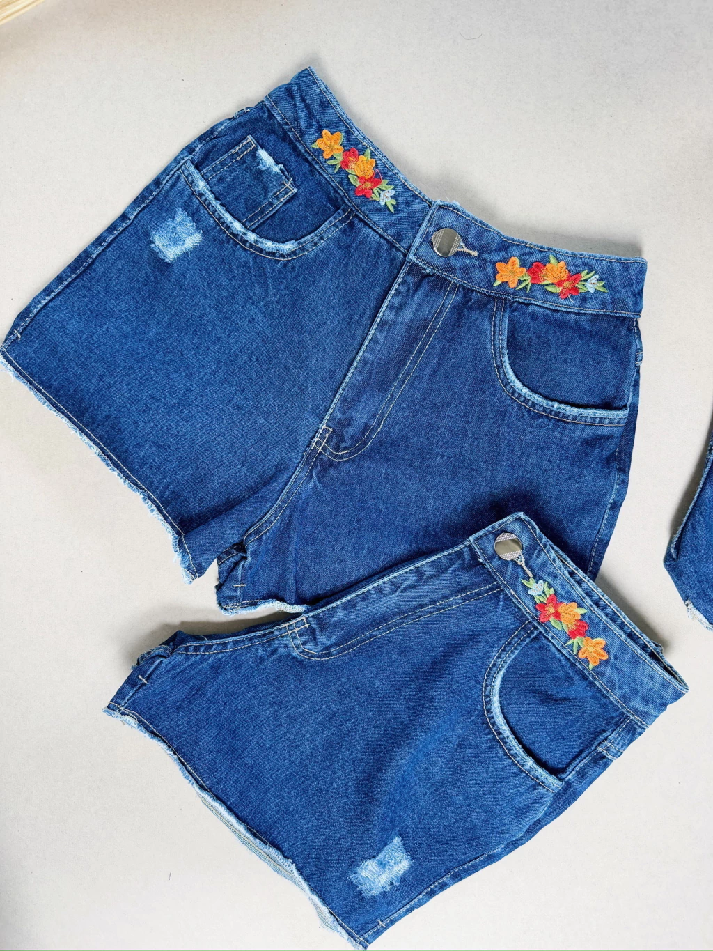Short Jeans Feminino Bordado Flores no Cós Com Bolso