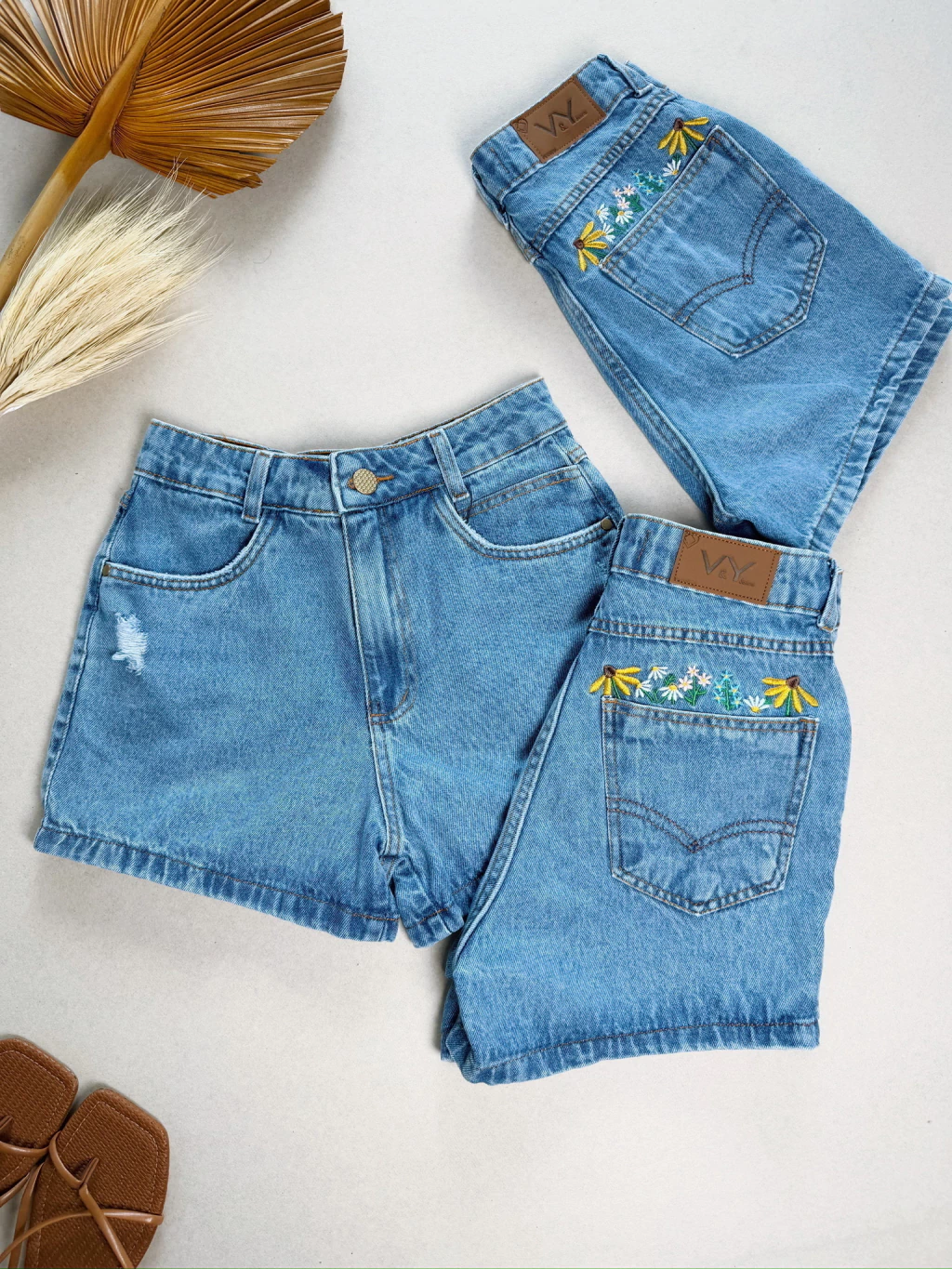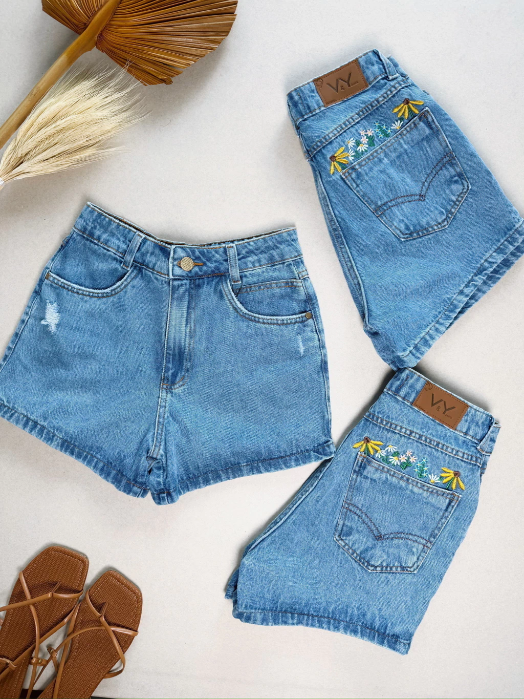 Short Jeans Feminino Bordado Jardim Flores Em Cima do Bolso Traseiro Com Bolso