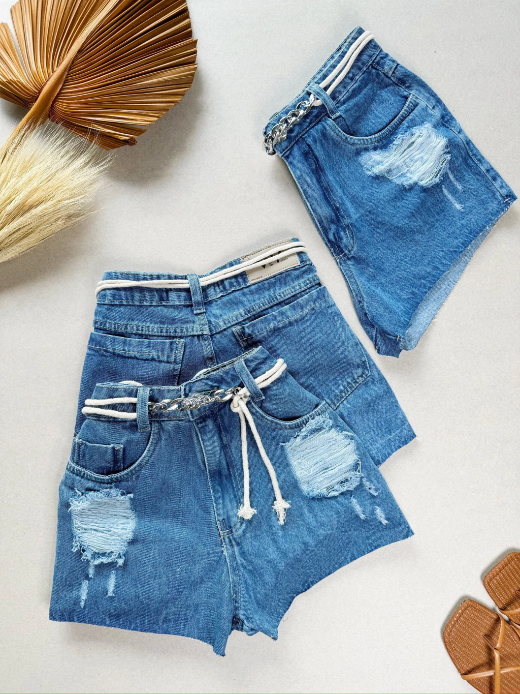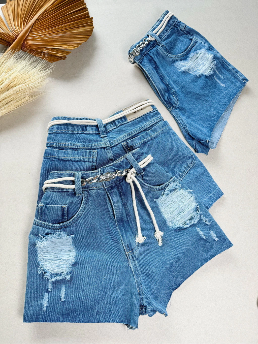 Short Jeans Feminino Cinto Cordinha Corrente Com Bolso