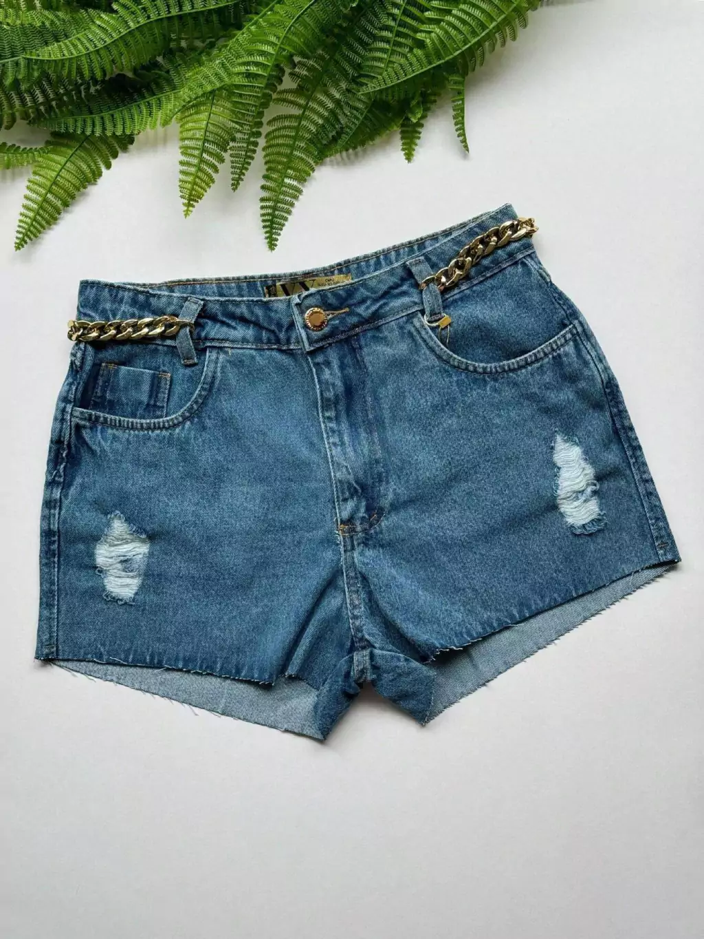 Short Jeans Feminino Cinto Corrente Lateral Dourada Com Bolso