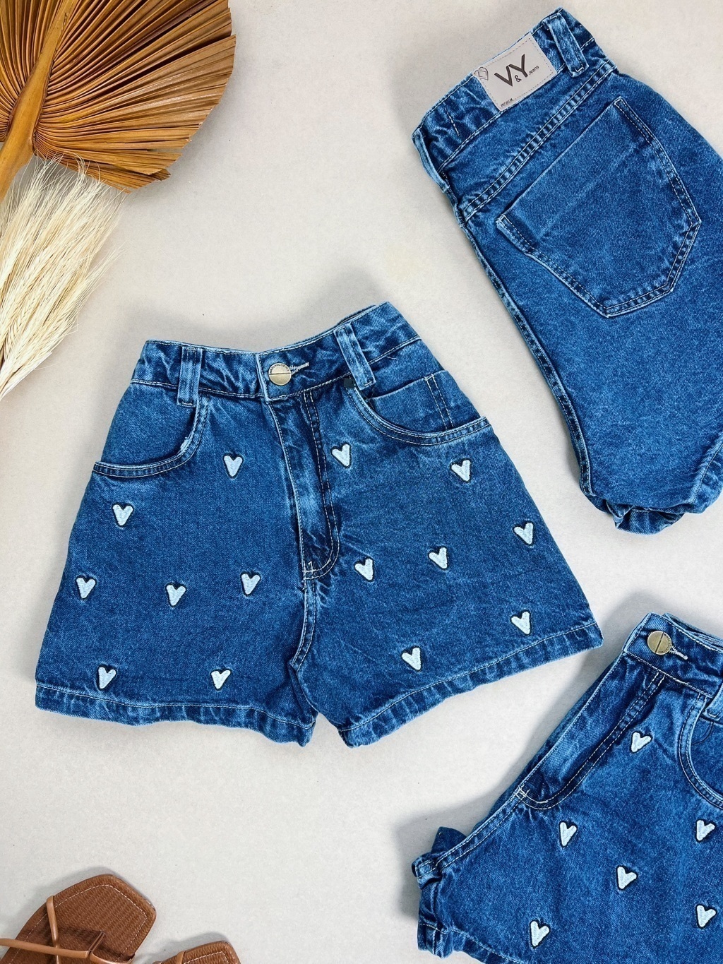 Short Jeans Feminino Corações Branco e Preto Com Bolso