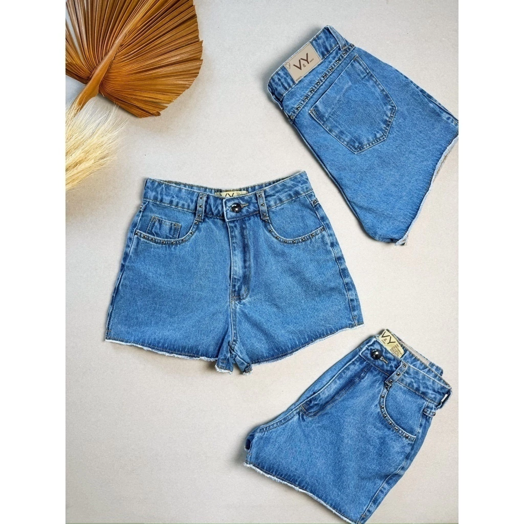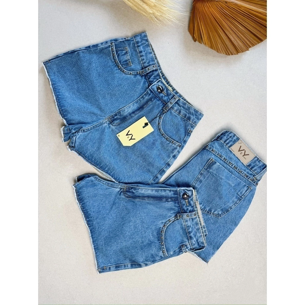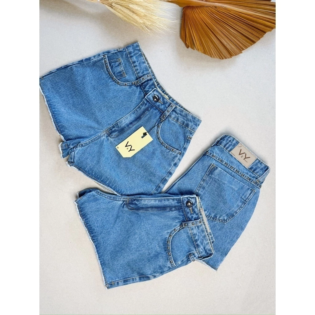 Short Jeans Feminino Tachinhas no Bolso Pedraria Melhor Qualidade