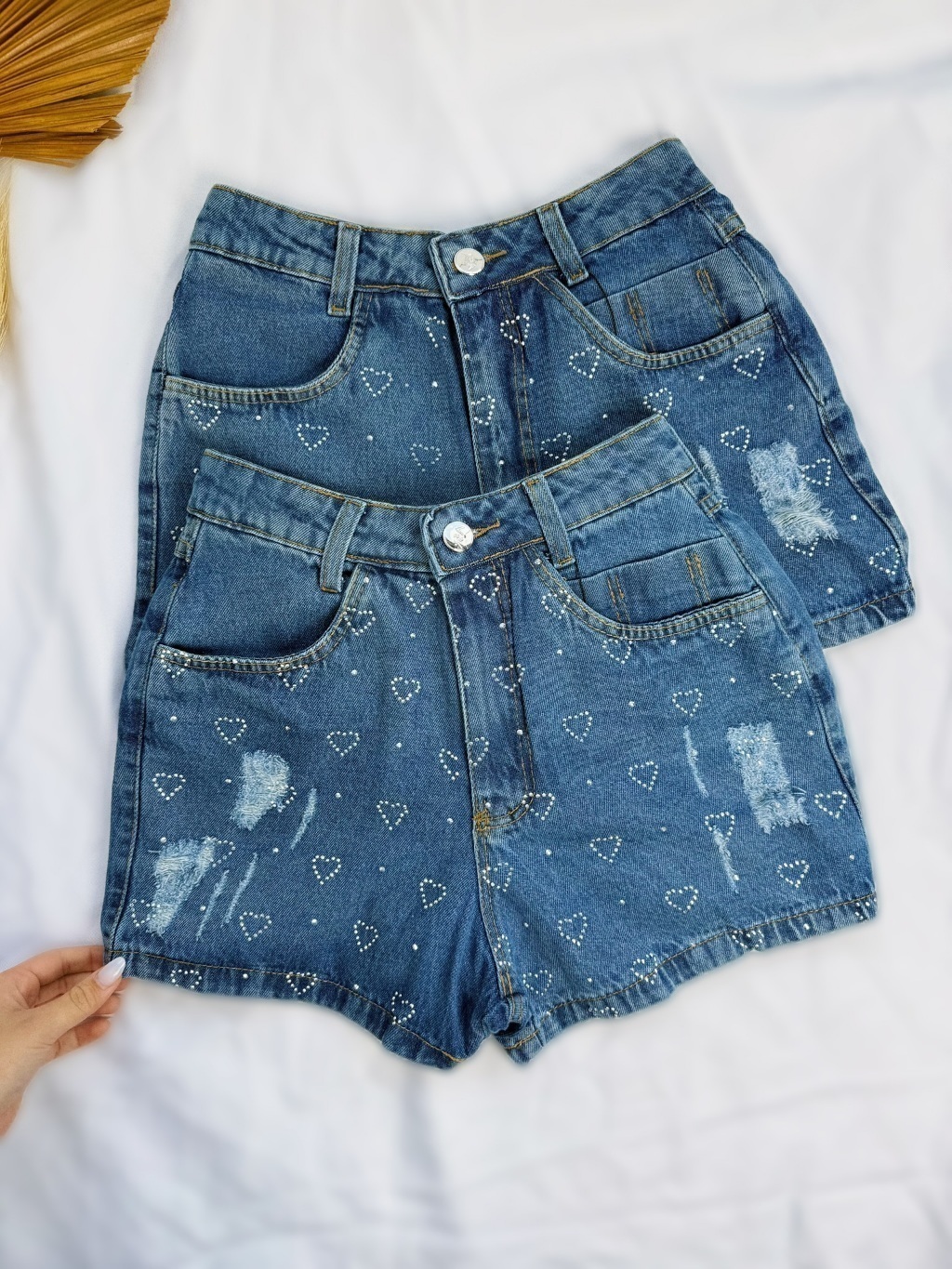Short Jeans Jéssica Feminino Corações Pequenos Puído Pedraria Pedrinhas Com Bolso